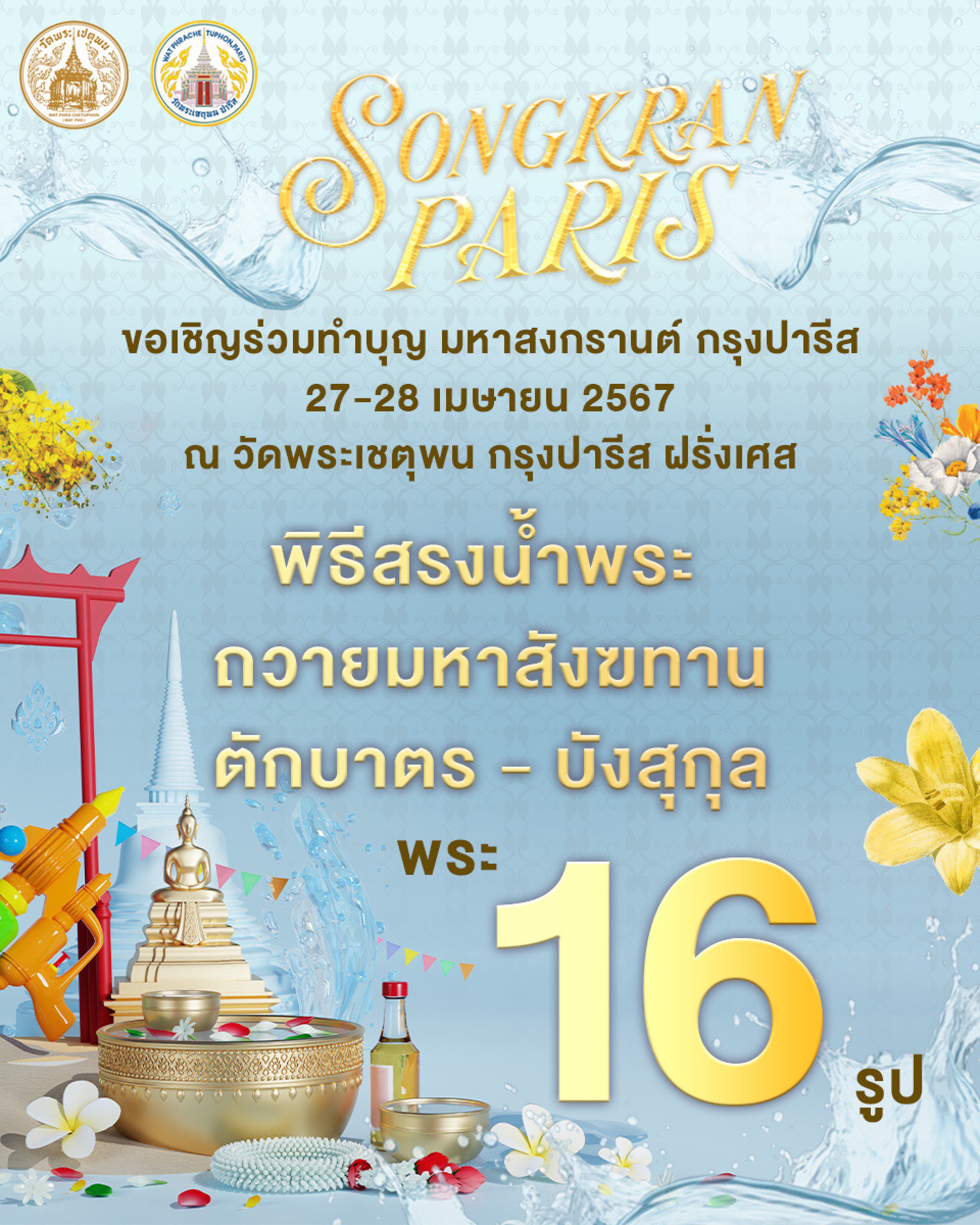 ขอเชิญร่วมทำบุญ มหาสงกรานต์ กรุงปารีส วันที่ 27 - 28 เมษายน 2567 ณ วัดพระเชตุพน กรุงปารีส ฝรั่งเศส