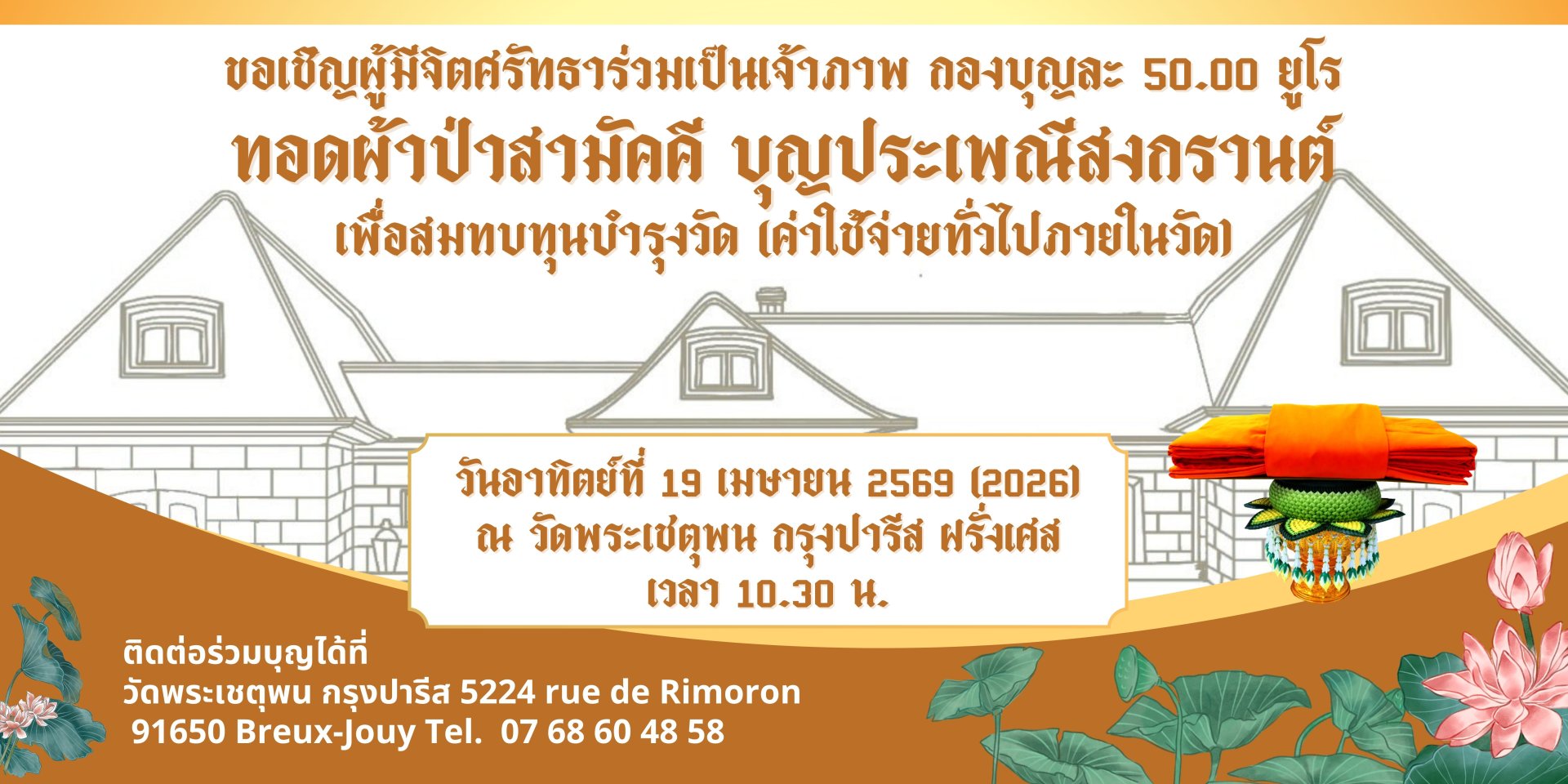 ขอเชิญผู้มีจิตศรัทธาร่วมทำบุญทอดผ้าป่าสามัคคี บุญประเพณีสงกรานต์ ประจำปี 2569/2026