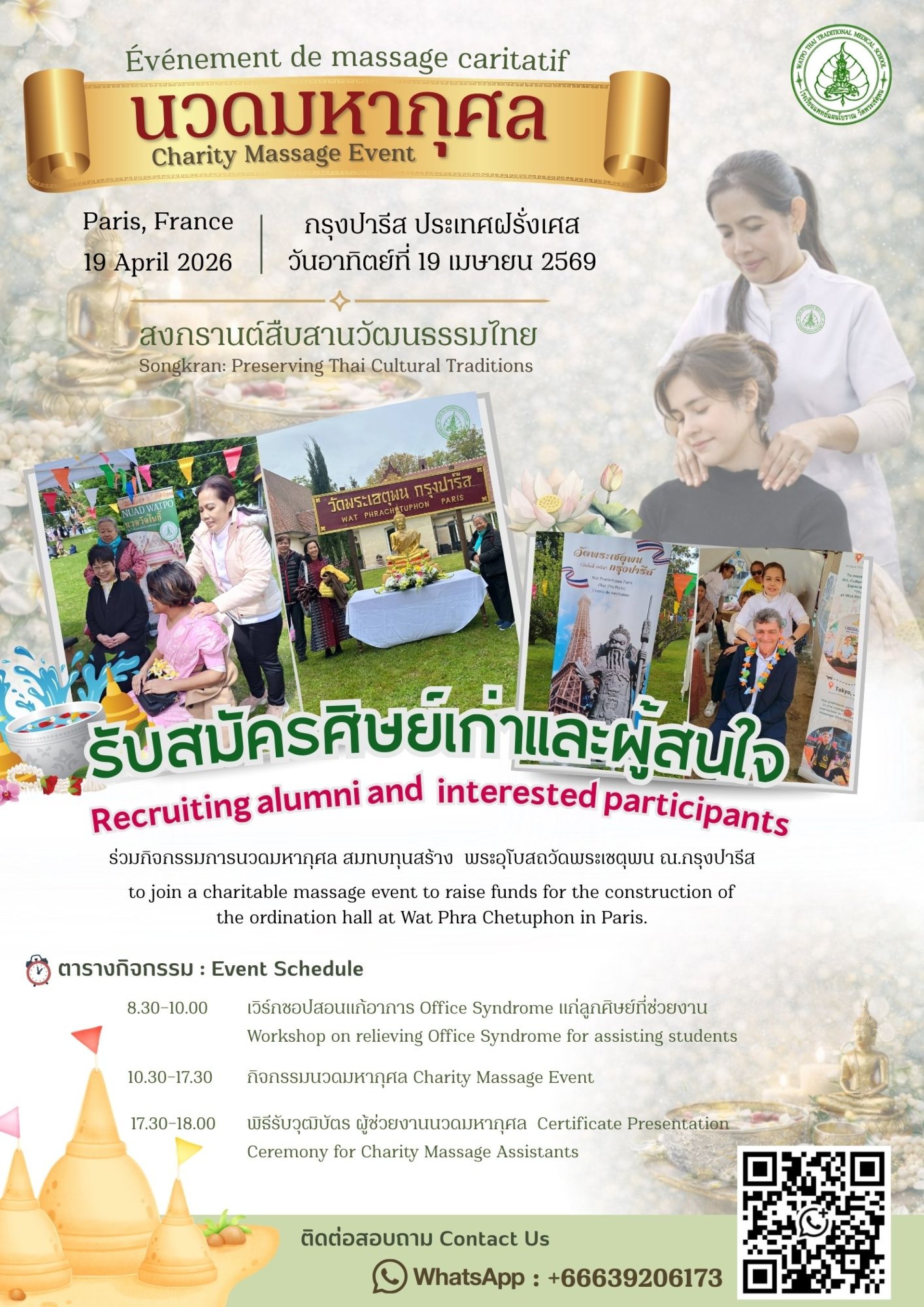 วัดพระเชตุพน กรุงปารีส ร่วมกับสมาคมนวดและสปาไทยในฝรั่งเศส และโรงเรียนแพทย์แผนโบราณ วัดโพธิ์ ขอเชิญศิษย์เก่าและผู้สนใจ เข้าร่วมกิจกรรมการนวดมหากุศล เพื่อนำรายได้สมทบทุนสร้างอุโบสถ วัดพระเชตุพน กรุงปารีส เนื่องในงานสงกรานต์ วันอาทิตย์ที่ 19 เมษายน 2569 โดยมีโปรแกรม ดังนี้