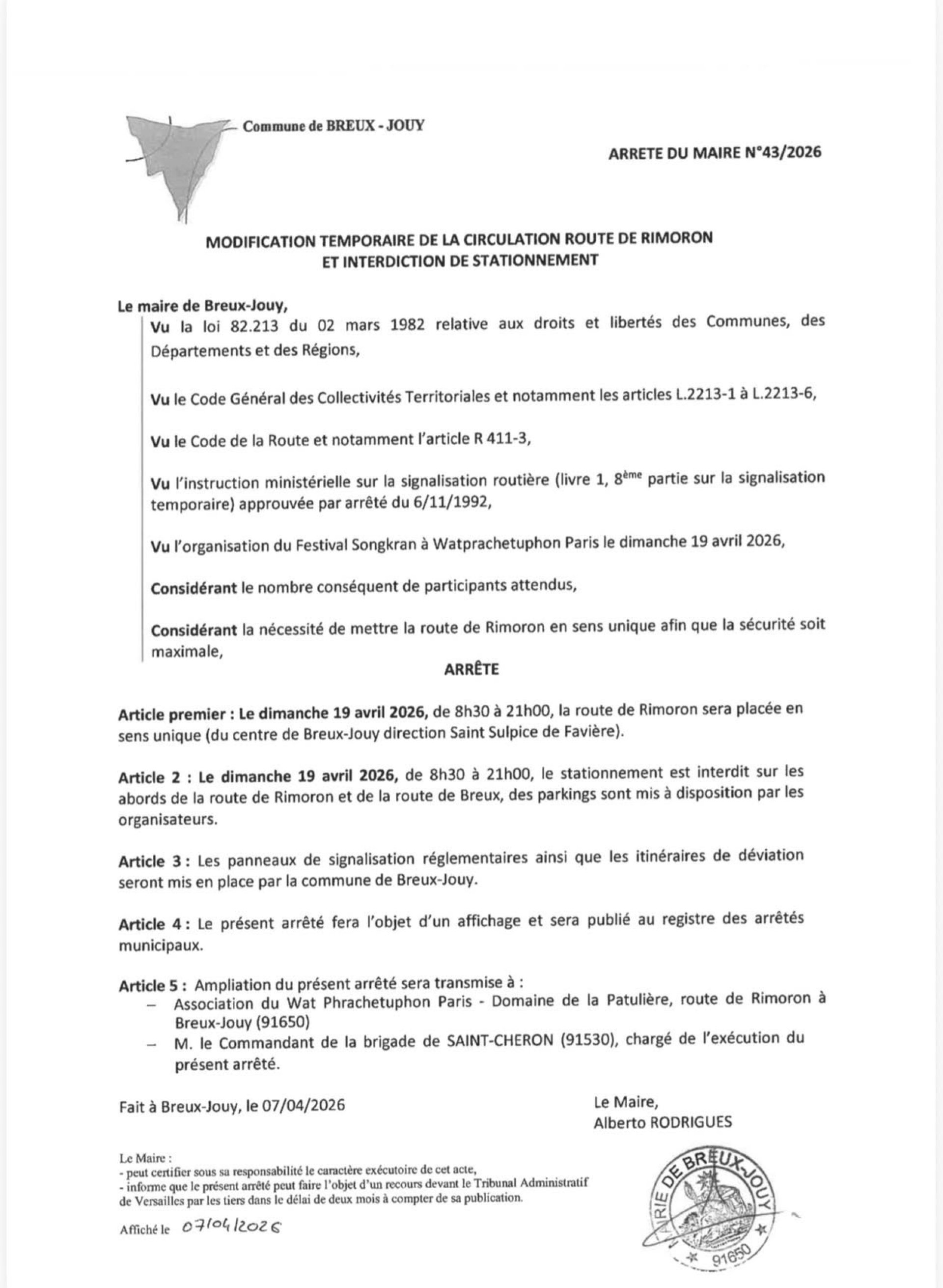อนึ่ง ทางวัดขอความร่วมมือผู้มาเที่ยวงานทุกท่าน ห้ามจอดรถริมถนน Rue de Rimoron ทั้ง 2 ฝั่ง ตลอดแนวถนนทางเข้าวัด เนื่องจากผิดกฏหมายจราจร เพื่อให้รถสัญจรได้สะดวก ปลอดภัย และไม่กีดขวางการจราจร หากผู้ใดฝ่าฝืนจอด จะโดนเจ้าหน้าที่เรียกปรับตามกฏหมาย และท่านต้องรับผิดชอบเอง