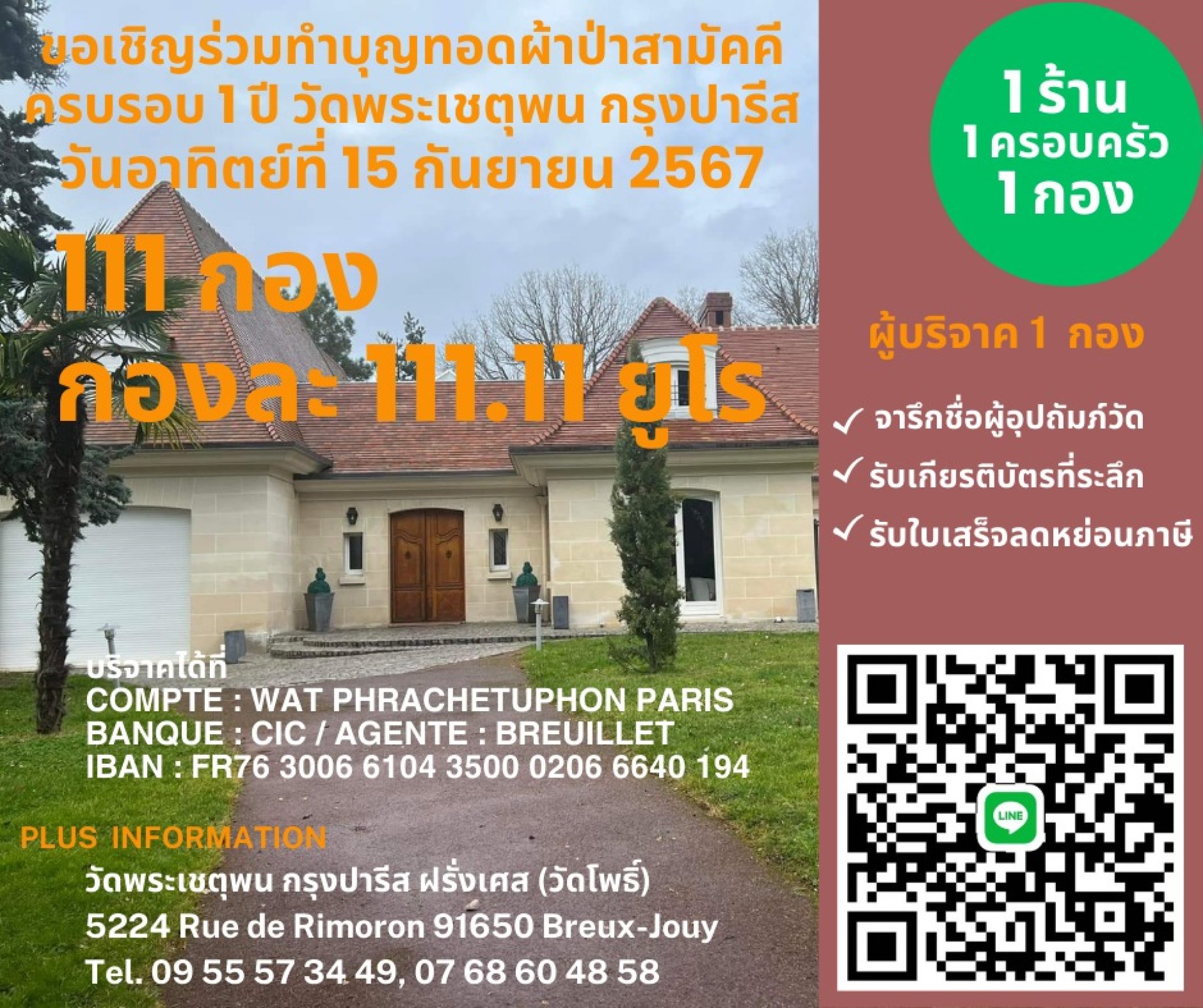 Inviting all faithful people. Participate in the merit-making ceremony of donating the Pha Pa Samakkhi To provide funds to support the temple in various aspects By accepting as host 1 group, 111.11 euros each or according to your capacity.