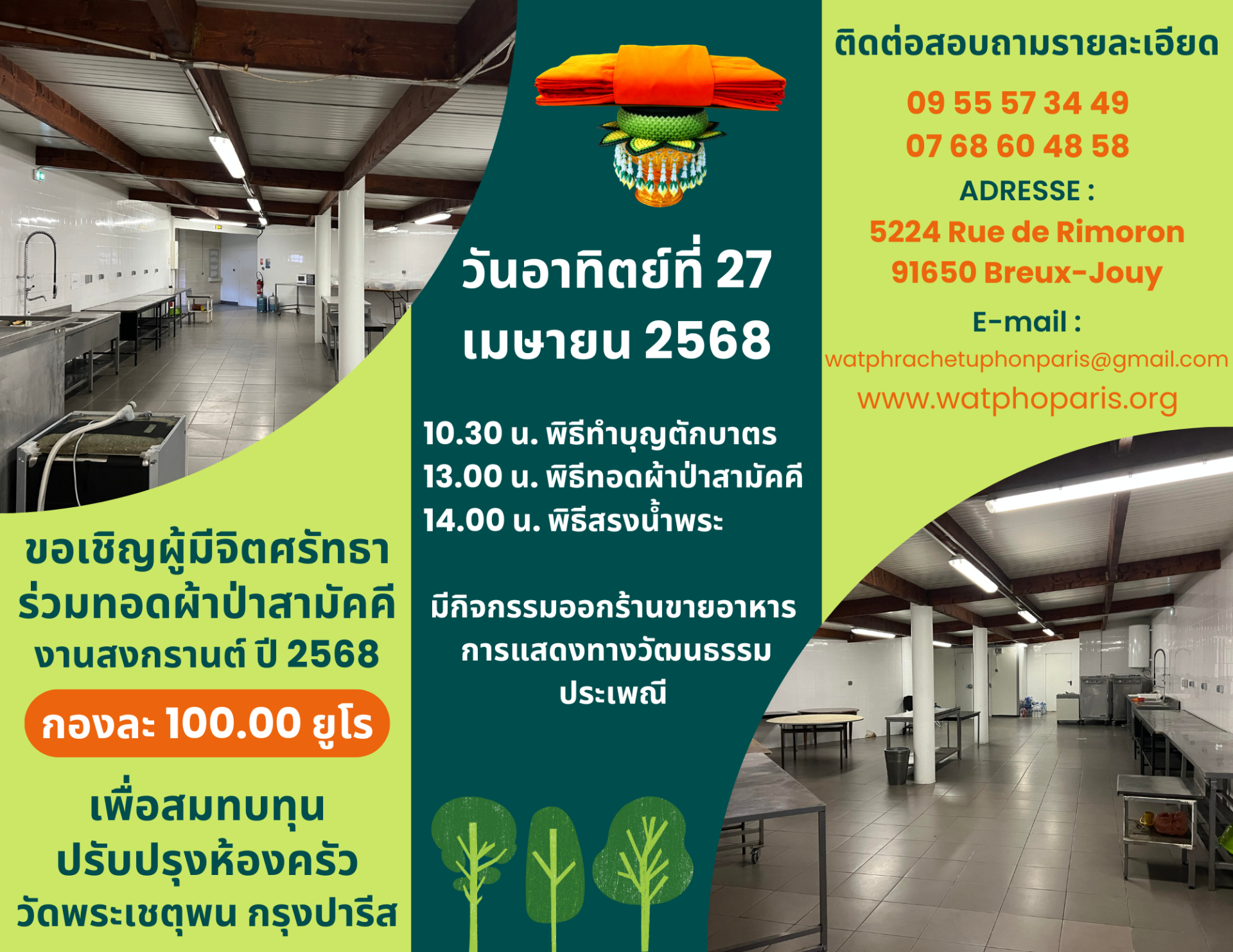 Nous invitons les fidèles à se joindre à nous pour faire don du phaapaa uni. Pour collecter des fonds afin de rénover la cuisine du Wat Phra Chetuphon, Paris (Wat Pho) pour le festival de Songkran en 2025.